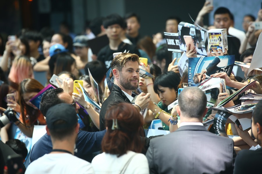 發(fā)布會尾聲,三位主創(chuàng)拿起鼓槌一同敲響中國鼓,為電影在中國市場的引爆加油助威,克里斯·海姆斯沃斯更是拿出“雷神”掄錘的架勢,現(xiàn)場玩了把花式掄槌,再次引得觀眾尖叫不斷。