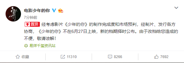 官方賬號發文稱,“經考慮影片《少年的你》的制作完成度和市場預判,經制片、發行各方協商,《少年的你》不在6月27日上映,新的檔期擇時公布。由于改檔給您造成的不便,敬請諒解!”