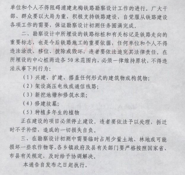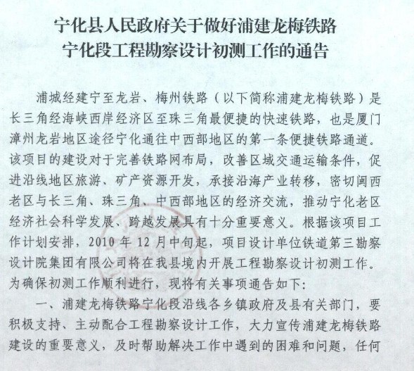 關于做好浦建龍梅鐵路寧化段工程勘察設計初測工作的通告