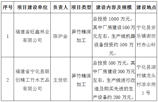 為進一步提升我縣筍竹精深加工水平,促進我縣筍竹產業發展,根據《福建省省級財政竹產業發展專項資金管理辦法》(閩財農〔2018〕31號)、《福建省財政廳、福建省林業局關于下達2019年竹產業發展專項資金的通知》(閩財農指〔2019〕16號)、《寧化縣林業局關于做好2019年竹產業發展專項資金補助申報的通知》(寧林〔2019〕149號)的要求,現將擬申報2019年省級財政竹產業發展專項資金—筍竹精深加工示范縣項目情況予以公示。
