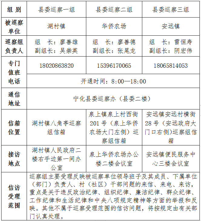 根據縣委巡察工作部署要求,經縣委巡察工作領導小組同意,從5月8日開始,縣委巡察組對湖村鎮、華僑農場、安遠鎮等3個單位開展巡察,巡察時間為30天左右,目前3個巡察組已進駐巡察。