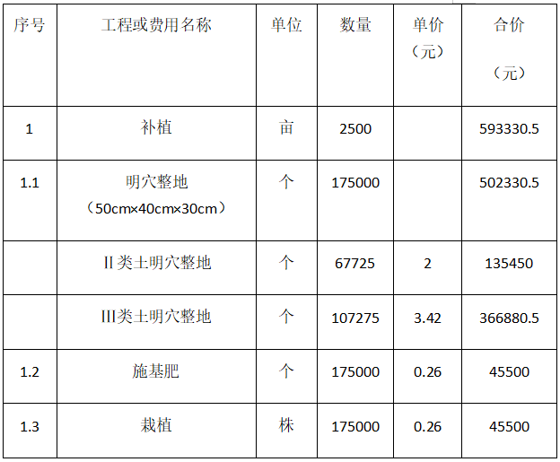 單價:Ⅱ類土(竹園、磜下共967.5畝)每株2.52元;Ⅲ類土(吳陂、江家、小吳等共1532.5畝)每株3.94元。補植總投資約59.33萬元。按實結算,結算投資以竣工驗收面積及株數計算確定。
