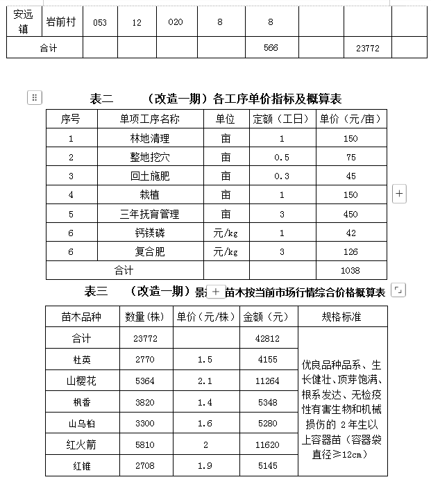 2.5施工內(nèi)容:為林地清理、整地挖穴、施基肥、回土、配置樹種、栽植、撫育管理等、每畝需要營林工日5.8個(gè),施工單價(jià)870元/畝,按畝平均種植42株景觀樹計(jì),需要鈣鎂磷42kg計(jì)42元,撫育期間施復(fù)合肥42kg計(jì)126元,平均單價(jià)1038元/畝,見表二,(改造一期)景觀林工程概算價(jià)58.7508萬元。采購苗木23772株,經(jīng)詢價(jià),見表三。