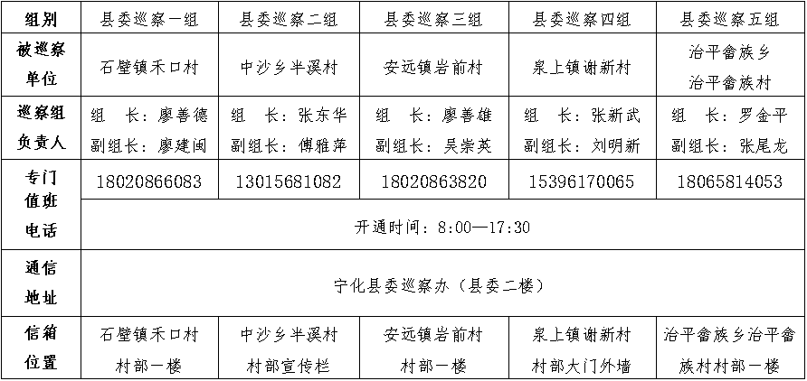 根據(jù)縣委巡察工作部署要求,從10月27日開始,縣委巡察組對石壁鎮(zhèn)禾口村、中沙鄉(xiāng)半溪村、安遠(yuǎn)鎮(zhèn)巖前村、泉上鎮(zhèn)謝新村、治平畬族鄉(xiāng)治平村等5個重點(diǎn)村開展巡察“回頭看”,巡察時間為7天左右,目前5個巡察組已進(jìn)駐巡察。