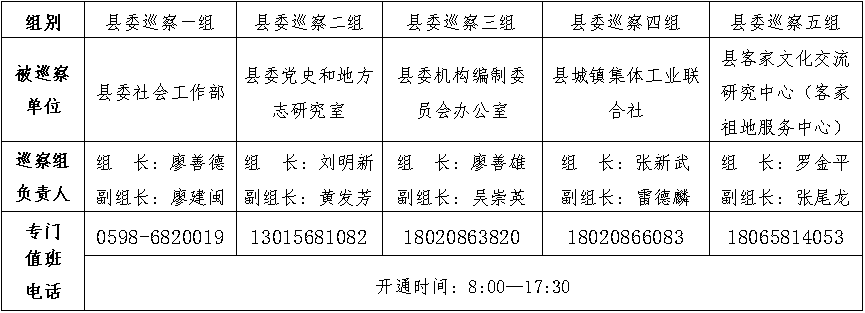 根據縣委巡察工作部署要求,經縣委巡察工作領導小組同意,從12月15日開始,縣委巡察組對縣委社會工作部、縣委黨史和地方志研究室、縣委機構編制委員會辦公室、縣城鎮集體工業聯合社、等4個單位開展常規巡察,對縣客家文化交流研究中心(客家祖地服務中心)開展巡察“回頭看”,巡察時間為30天左右,目前5個巡察組已進駐巡察。