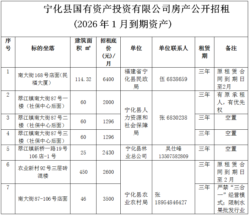 寧化縣國有資產(chǎn)投資有限公司房產(chǎn)(2026年1月到期資產(chǎn))公開招租公告