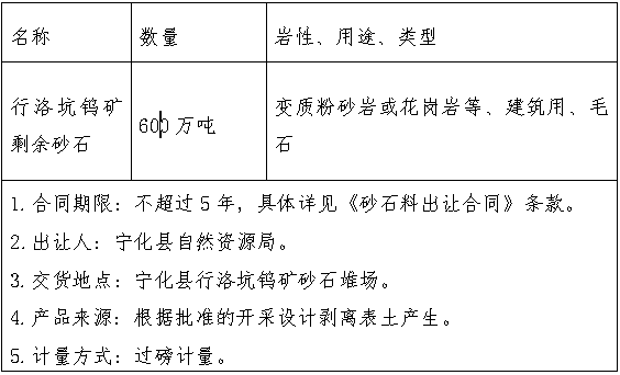 根據《中華人民共和國拍賣法》《福建省自然資源廳關于印發福建省規范和完善砂石開采管理暫行規定的通知》(閩自然資發〔2023〕51號)、《寧化縣人民政府辦公室關于印發〈采礦廢石及工程建設產出剩余砂石土處置方案〉的通知》(寧政辦規〔2023〕1號)、《寧化縣人民政府辦公室關于采礦廢石及工程建設產出剩余砂石土處置方案的補充通知》(寧政辦〔2023〕25號)等法律法規和文件精神,經寧化縣人民政府批準,寧化縣自然資源局以公開拍賣方式出讓行洛坑鎢礦剩余砂石。現將有關事宜公告如下: