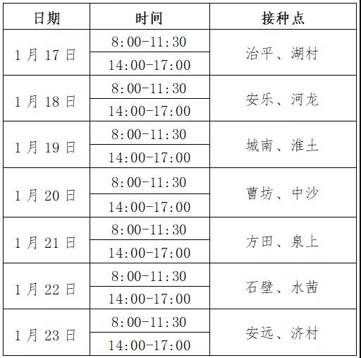 根據市新冠病毒疫苗接種工作總體安排,現將我縣1月17日-1月23日新冠病毒疫苗接種安排如下:
