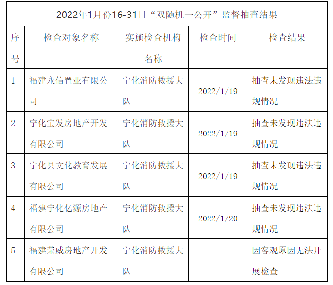 寧化縣消防救援大隊將2022年1月份16-31日對以下隨機抽查場所檢查結果公告如下: