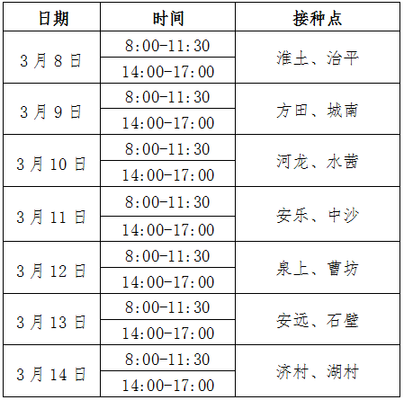 根據(jù)市新冠病毒疫苗接種工作總體安排,現(xiàn)將我縣3月8日-3月14日新冠病毒疫苗接種安排如下: