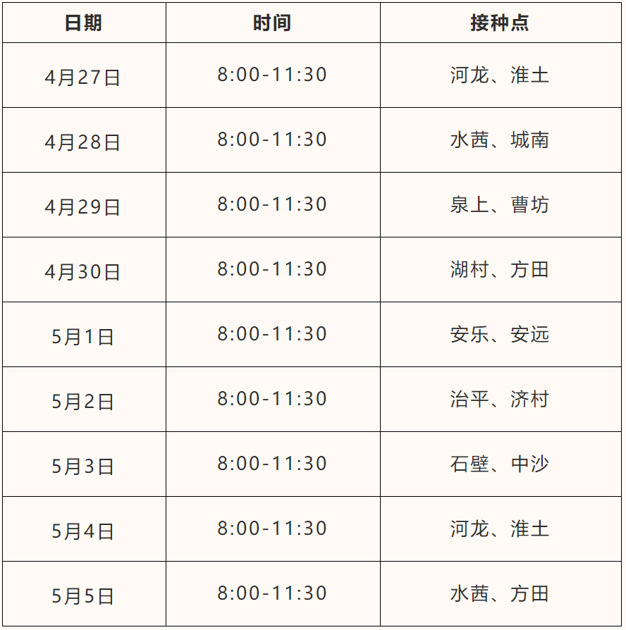 根據市新冠病毒疫苗接種工作總體安排,現將我縣4月27日-5月5日新冠病毒疫苗接種安排如下: