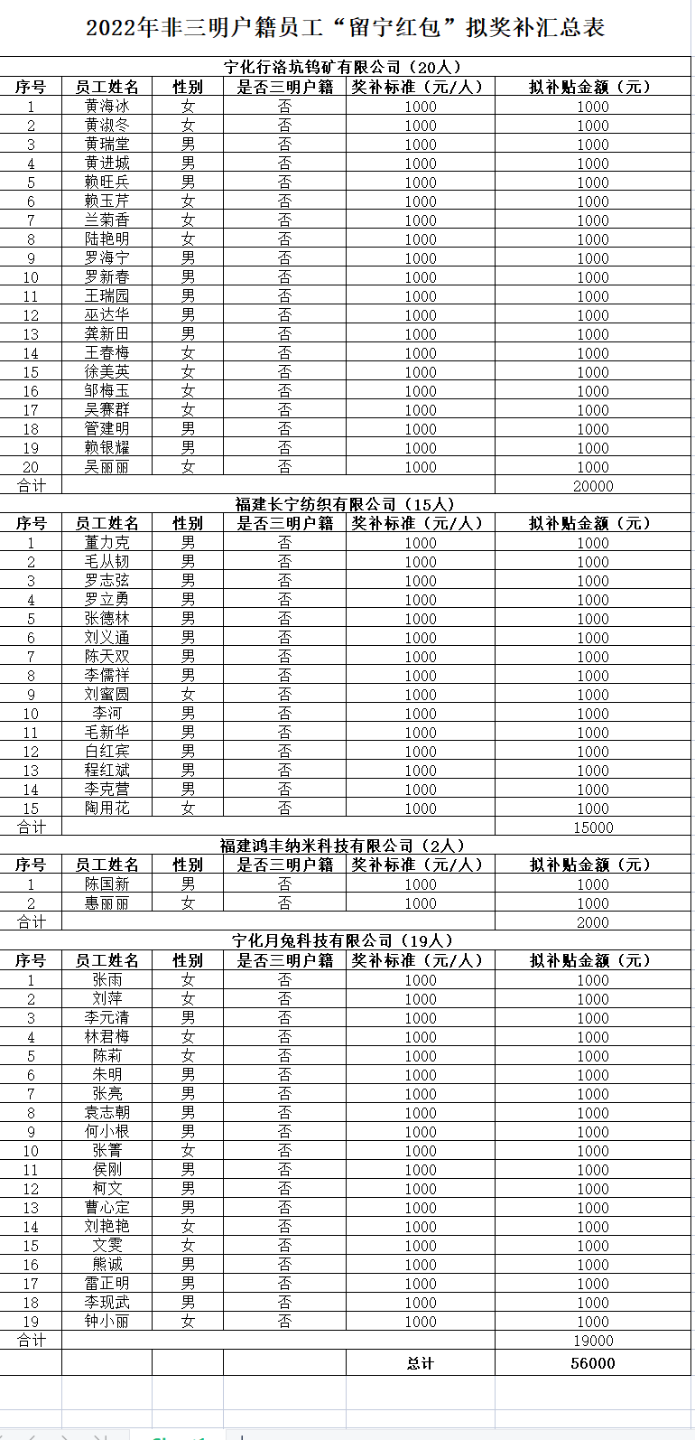 根據《寧化縣人民政府關于印發寧化縣促進企業穩崗穩工十條措施的通知》(寧政文〔2022〕8號)文件精神,經人社局、工信局和財政局對企業申報材料進行審核,確定符合2022年非三明戶籍員工“留寧紅包”獎補企業4家共計56人,發放標準1000元/人,擬發放金額:56000元。詳情見附件。現將有關信息進行公示。