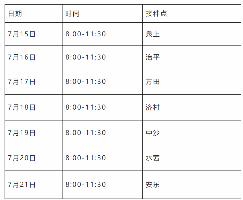 根據市新冠病毒疫苗接種工作總體安排,現將我縣7月15日-7月21日新冠病毒疫苗接種安排如下: