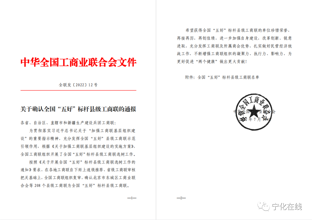 ◎喜報!寧化縣工商聯(lián)獲評全國“五好”標桿縣級工商聯(lián)稱號