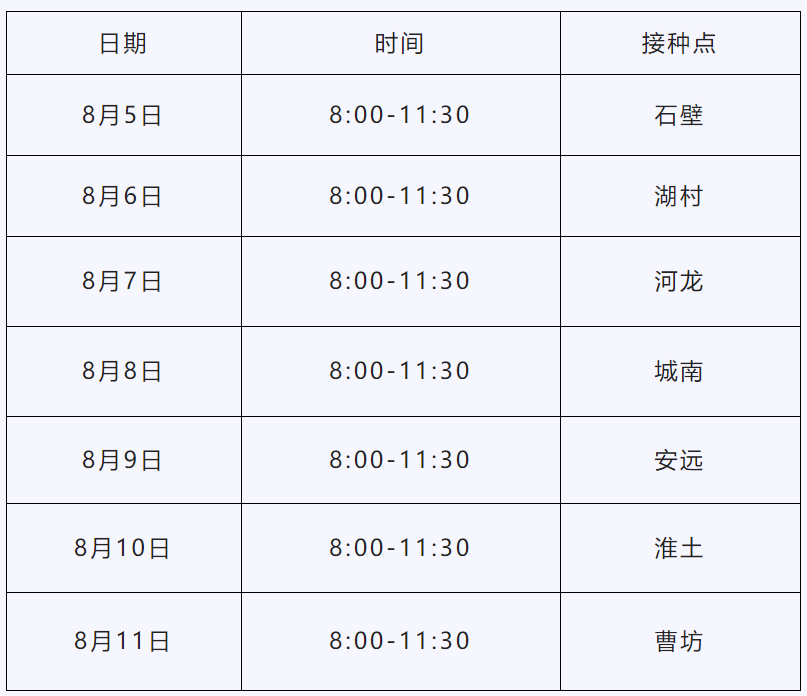根據(jù)市新冠病毒疫苗接種工作總體安排,現(xiàn)將我縣8月5日-8月11日新冠病毒疫苗接種安排如下:
