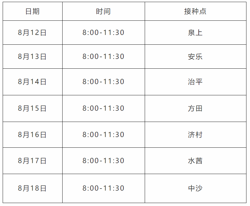 根據市新冠病毒疫苗接種工作總體安排,現將我縣8月12日-8月18日新冠病毒疫苗接種安排如下: