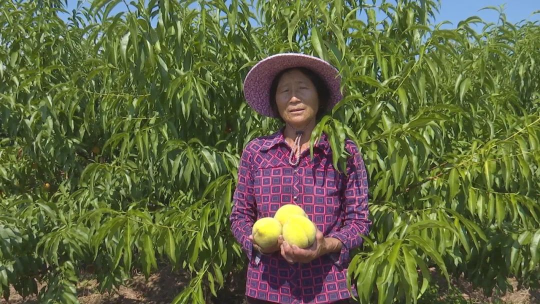 在中沙鄉(xiāng)半溪村連綿起伏的果山上,6.67公頃黃桃林郁郁蔥蔥。現(xiàn)在這里的黃桃個大飽滿,掛在果樹上讓人垂涎欲滴。果農(nóng)們正在將成熟的黃桃采摘下來,放入竹籃中。