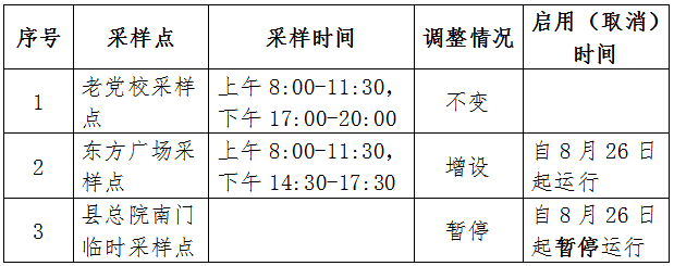 根據(jù)當前疫情防控形勢,為方便廣大群眾核酸檢測需求,經(jīng)研究,決定自8月26日起增設(shè)東方廣場核酸采樣點,暫停縣總院南門臨時核酸采樣點。黃碼人員請前往老黨校核酸采樣點的黃碼通道進行核酸采樣。