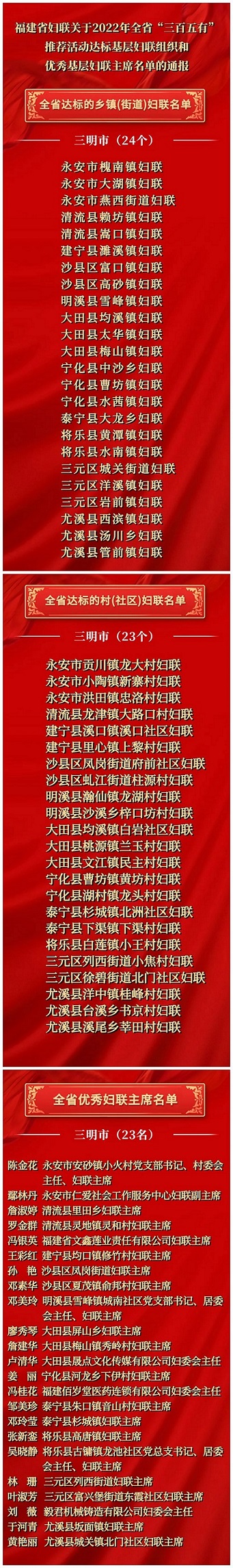 其中,由三明市婦聯(lián)推薦的24個(gè)鄉(xiāng)鎮(zhèn)(街道)婦聯(lián)、23個(gè)村(社區(qū))婦聯(lián)、23名婦聯(lián)主席榜上有名。一起來看看,寧化都有哪些上榜吧。