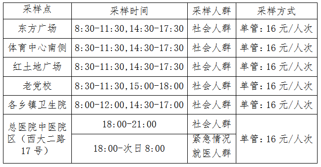12月24日起將全縣現(xiàn)有核酸采樣點一并調整為社會人群愿檢盡檢收費采樣點;總醫(yī)院中醫(yī)院區(qū)核酸采樣點社會人群采樣時間調整為18:00-21:00,緊急情況就醫(yī)人群采樣時間為:18:00-次日8:00;各鄉(xiāng)鎮(zhèn)衛(wèi)生院(不包括翠江社區(qū)衛(wèi)生服務中心和城郊衛(wèi)生院)采樣時間由24小時開放調整為8:00-12:00,14:30-17:00。調整后全縣核酸采樣點分布如下: