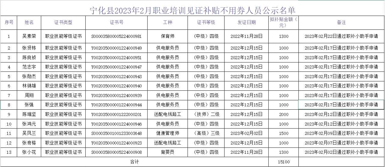 ◎寧化縣2023年2月職業培訓見證補貼不用券信息公示