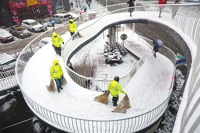 圖為在湖北省襄陽市,市政管理處工人在鋪設防滑墊。