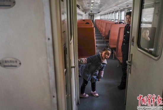 1月19日,從榆林開往西安的7005次客車上,4歲的雨欣(音)向隔壁車廂張望。她和媽媽正從黃陵縣的奶奶家一起坐火車回蒲城的家。