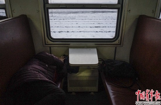 1月20日,從西安開往榆林的7006次客車上,在西安打工的李葉子(左)請了兩天假,回鄉探親。
