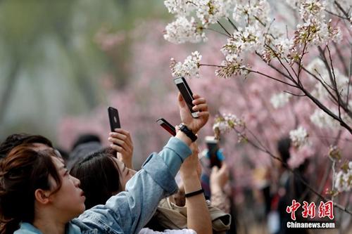 資料圖:正在舉辦櫻花節的玉淵潭公園吸引眾多游客。圖為游人在櫻花樹下拍照。中新社記者 滿會喬 攝
