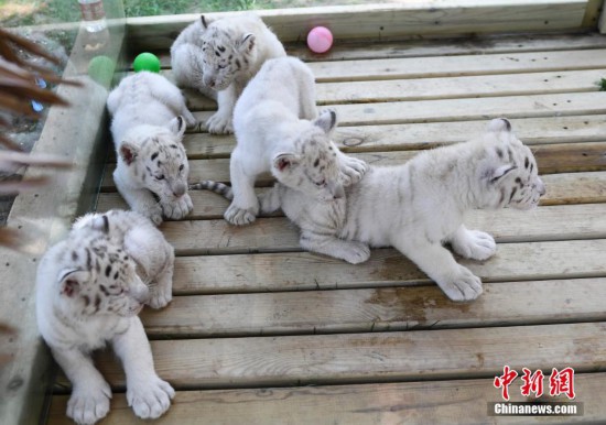 5月20日,雪虎五胞胎嬉戲玩耍。當日,以中國“五岳”名山命名的雪虎五胞胎在濟南野生動物世界與游客見面,“雪泰”、“雪衡”、“雪華”、“雪恒”、“雪嵩”5只小雪虎模樣呆萌,十分可愛。 中新社記者 張勇 攝