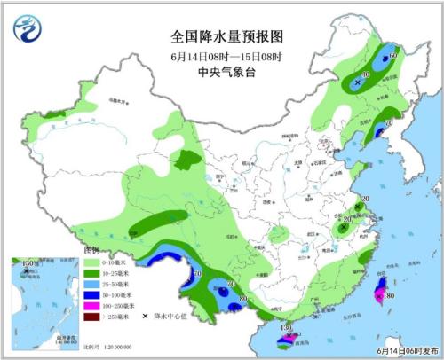 6月14日08時至15日08時,東北地區(qū)有對流性天氣,云南海南臺灣等地有較強降水。內(nèi)蒙古東北部、黑龍江西部、吉林西部和東南部、遼寧中東部、山東半島東部、江淮中東部等地有中到大雨,黑龍江西北部、遼寧東南部等地局地有暴雨,上述部分地區(qū)伴有雷暴大風、冰雹等強對流天氣;西藏東南部、云南西北部和東部、雷州半島、海南島中北部以及臺灣等地的部分地區(qū)有大到暴雨,海南島北部、臺灣南部等地局地有大暴雨(100~180毫米)。