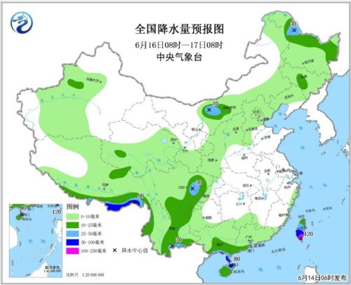 預計6月14日08時至15日08時,江蘇中部等地仍需防范局地的雷暴大風或冰雹天氣;此外,黑龍江西部、遼寧南部、山東半島、江蘇中部、云南西北部及東南部、廣西南部、廣東南部、海南等地將有短時強降水天氣,最大小時降水量20~40毫米,局地可達50毫米。
