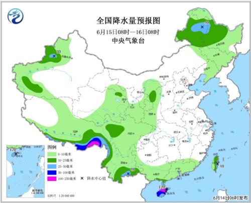 6月15日08時至16日08時,內(nèi)蒙古東北部、海南島等地有較強降水。內(nèi)蒙古東北部、黑龍江中西部、新疆伊犁河谷、四川西部、西藏東南部、云南西北部和南部、廣西南部、雷州半島、海南島以及臺灣中東部等地有中到大雨,其中,西藏東南部、海南島中北部等地的部分地區(qū)有暴雨,局地大暴雨(100~120毫米),上述局地將伴有短時強降水、雷暴大風或冰雹等強對流天氣。