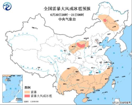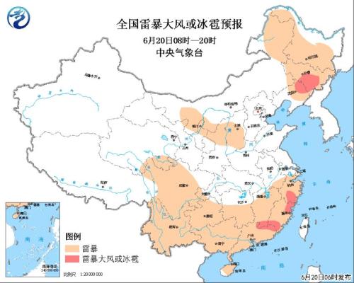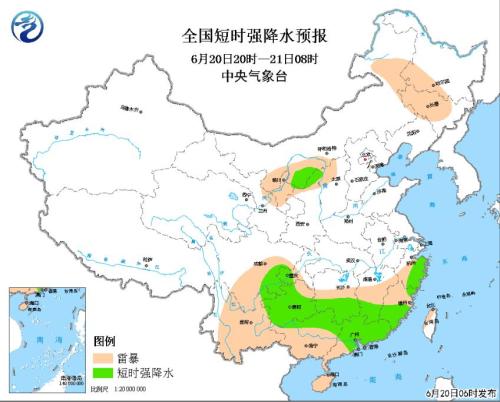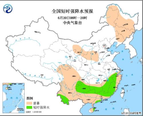 預計6月20日08時到21日08時,貴州、湖南中南部、江西、浙江、福建、廣東中北部、海南東北部、云南西南部等地的部分地區將有短時強降水天氣,小時雨強20-50毫米,局地可達60毫米以上;另外,內蒙古中部和東部、吉林南部、遼寧東北部、浙江南部、福建北部和南部、廣東北部等地局地將有雷暴大風或冰雹天氣。