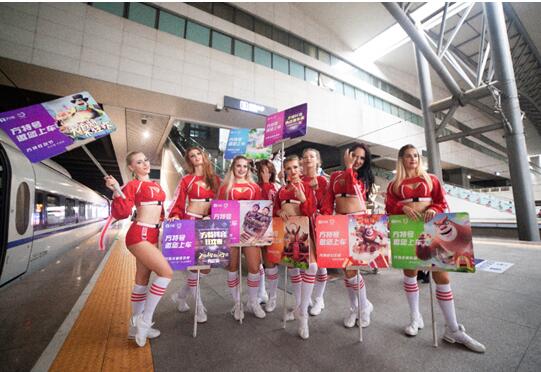 “方特號”發(fā)車當日早晨,熊大、熊二等華強方特原創(chuàng)動漫IP人偶以及多名足球?qū)氊?ldquo;空降”沈陽北站候車大廳和站臺。他們手持創(chuàng)意拍照板與旅客合影、派發(fā)小禮物,為列車首發(fā)儀式預熱,引來旅客們的積極參與。隨后,足球?qū)氊惡蛣勇伺紓兓盍λ纳涞谋硌堇_了發(fā)車儀式的序幕。在列車發(fā)車前,參加儀式的各位來賓觸發(fā)啟動球,宣布“方特號”動車組正式開跑。
