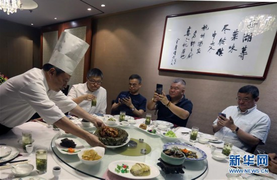 杭州酒家老板吳瑞康為客人端上自己親自制作的“叫化雞”(6月16日攝)。新華社記者 李鵬 攝