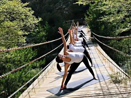 在距離谷底100多米的高空索橋上,瑜伽師們在橋面的“空中瑜伽館”上優雅晨練,時尚抖音舞團也跑到索橋中央激情開拍,這與不遠處的旅游演藝——峽谷高空走鋼絲驚險表演,構成一道令人嘆為觀止的人與自然創新和諧的獨特風景。