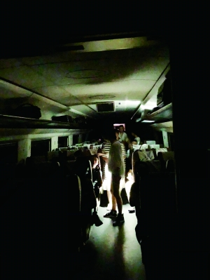 G40次列車斷電后,4號車廂里的乘客用手機照明。