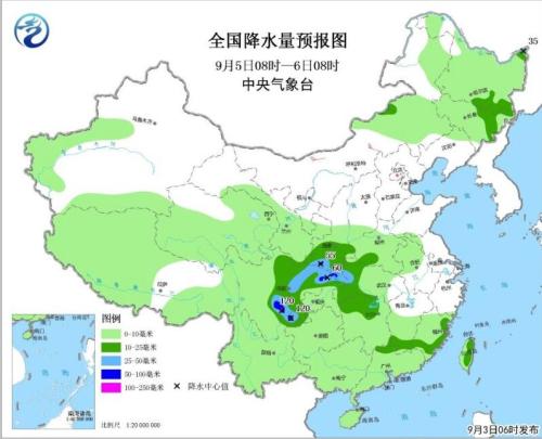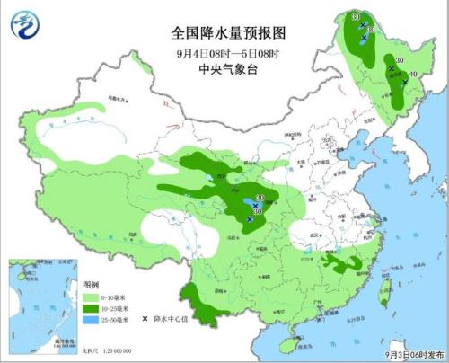圖1 全國降水量預報圖(9月3日08時-4日08時)