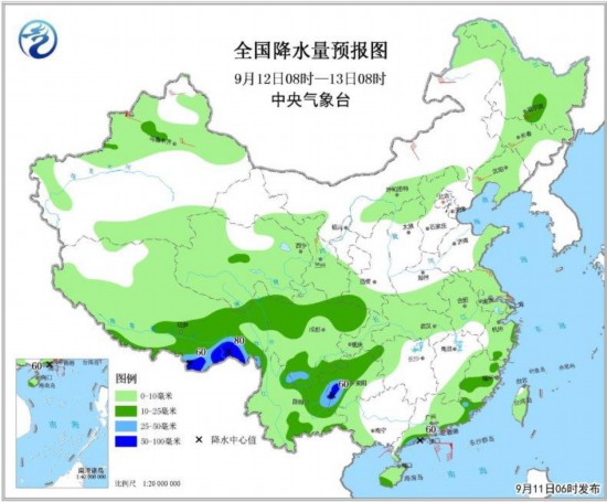 圖1 全國降水量預報圖(9月11日08時-12日08時)