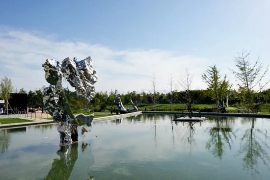 而當參觀者踱步出下沉廣場,由藝術家張錳策劃的新媒體展《時空和諧——熟悉與疏遠之間》已拉開帷幕。這場展覽有近30多件媒體藝術裝置作品呈現給觀眾。同時,在戶外還有公共雕塑展,展覽亦分為三個部分,重現《桃花源記》中武陵人的探秘之路,從“尋跡”伊始,到“芳澤”一游,再到“迷蹤”落幕,配合觀展動線,為觀眾帶來身臨其境的沉浸體驗。