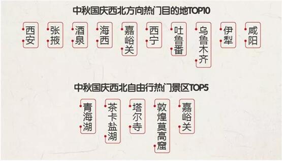 雙節期間,西安、張掖、酒泉、海西、嘉峪關、西寧、吐魯番、烏魯木齊、伊犁、咸陽等地成為預訂最火熱的旅游目的地;青海湖、茶卡鹽湖、塔爾寺、敦煌莫高窟、嘉峪關等西北景區頗受自助游游客的喜愛。