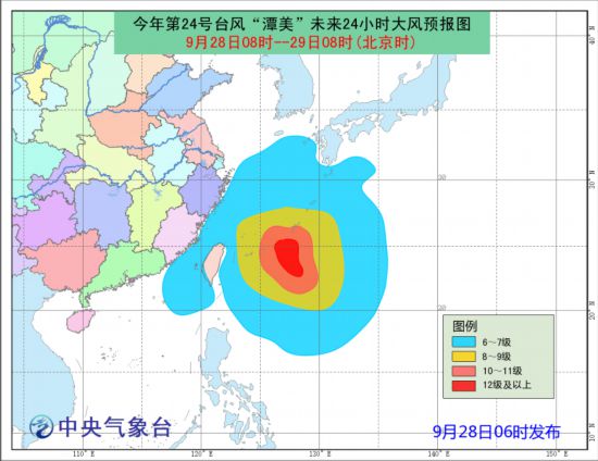 大風預報:28日08時到29日08時,東海大部、浙江沿海、福建沿海、臺灣沿海、臺灣海峽、巴士海峽、南海東北部將有6-7級大風,陣風8-9級,東海東南部和臺灣以東洋面將有8-11級大風,臺風中心經過的琉球群島以南洋面的部分海域風力可達12-14級,陣風15-16級。
