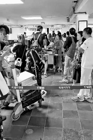 當地時間10月30日,隨著載有最后一批中國旅客的航班從塞班國際機場起飛,因超強臺風“玉兔”襲擊而被迫滯留在美屬北馬里亞納聯邦首府塞班的近1600名中國旅客已基本撤離。圖為中國游客在機場辦理登機手續。