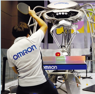 工作人員在歐姆龍展臺與機器人打乒乓球。 |
