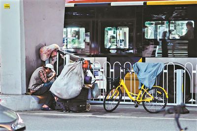 流浪者蝸居橋底,旁邊擺放的是其“家當(dāng)”。