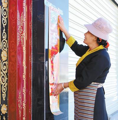 “以前只買卡賽等傳統年貨,現在得買很多新年貨,比如用藏文寫的春聯,還有剪紙等。”在拉薩市城關區蔡公堂鄉慈覺林村,巴桑的母親——54歲的尼瑪普赤把寫有藏文祝福的春聯貼在大門兩旁的瓷磚上,拿出倒“福”字貼在大門中間。