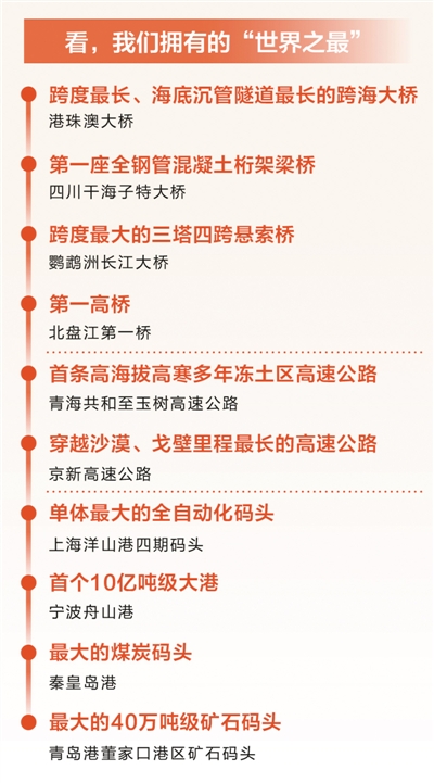 港珠澳大橋是個縮影。黨的十八大以來,隨著一座座重大工程的建成、一系列“世界之最”的誕生,我國交通基建水平已經整體站上“高原”、領先全球——