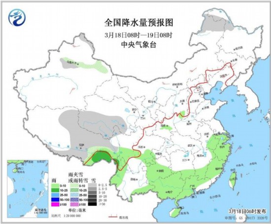 3月18日08時至19日08時,新疆沿天山附近、內蒙古東北部、西藏中東部、青海中南部等地的部分地區有小雪或雨夾雪;江南東部和南部、華南大部、云南西北部和東南部、西藏東南部及臺灣島等地有小雨。內蒙古中部、東北地區中南部等地的部分地區有4~5級風(見圖1)。