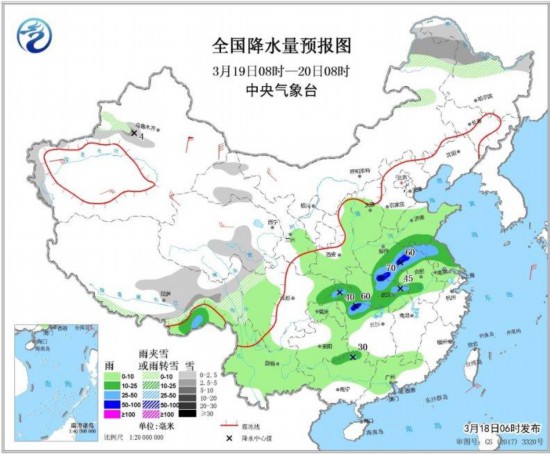 3月19日08時至20日08時,新疆沿天山地區和西南部高海拔山區、內蒙古東北部、黑龍江北部、西藏東部、青海東南部等地部分地區有小到中雪或雨夾雪;西北地區東南部、華北南部、黃淮、江淮、江漢、江南北部、重慶、貴州東部和南部、云南大部、廣西北部、廣東中部等地的部分地區有小到中雨,其中,河南東部、蘇皖北部、湖北北部、湖南西北部,重慶北部等地局地有大到暴雨(50~70毫米)。新疆東北部和南疆盆地、內蒙古西北部、青海北部等地部分地區有4~6級及以上風,其中,新疆東部部分地區有8~9級風(見圖2)。
